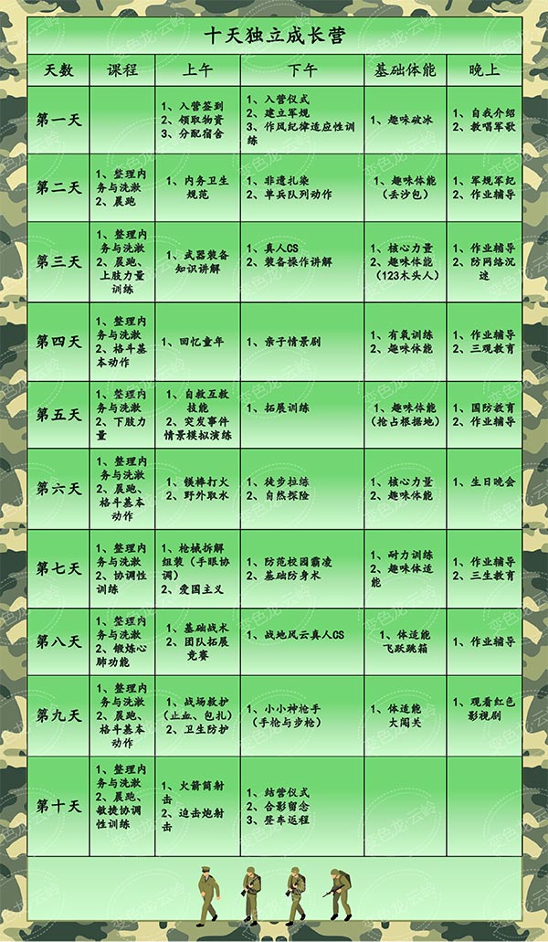 1、军营文化:行为习惯(帮助孩子改掉拖沓懒散、自由散漫、专注力差、自控力差等不良习惯;增强体质、锤炼意志,培养孩子独立、坚强、自信、勇敢等优秀军人品格。)