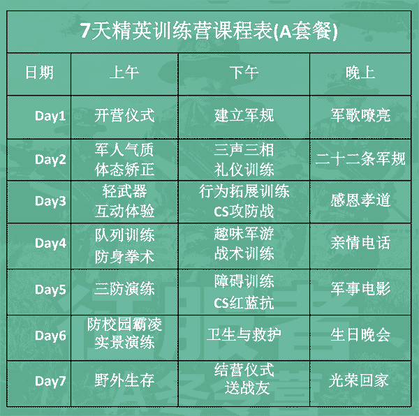 7.活动期间采用全封闭式军事化管理,营员统一食宿,教官与学员们同吃同住,活动期间不安排家长探视,有特殊原因,请提前联系;