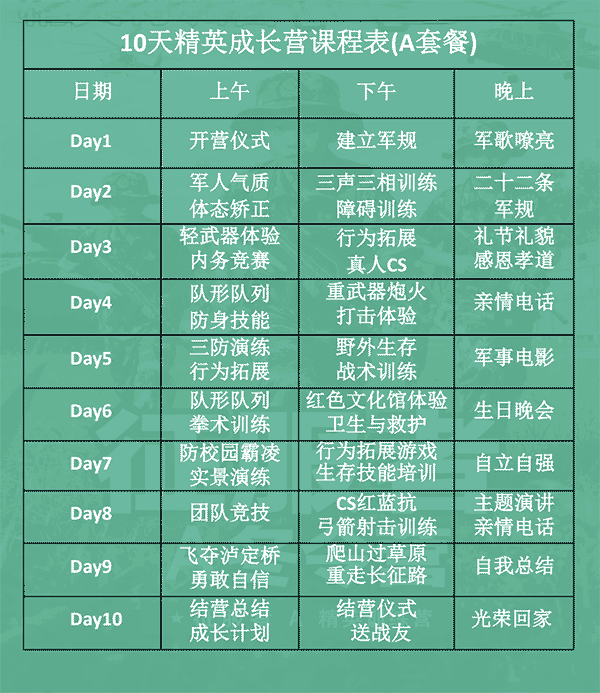 7.活动期间采用全封闭式军事化管理,营员统一食宿,教官与学员们同吃同住,活动期间不安排家长探视,有特殊原因,请提前联系;