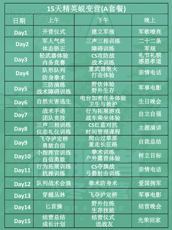 7.活动期间采用全封闭式军事化管理,营员统一食宿,教官与学员们同吃同住,活动期间不安排家长探视,有特殊原因,请提前联系;